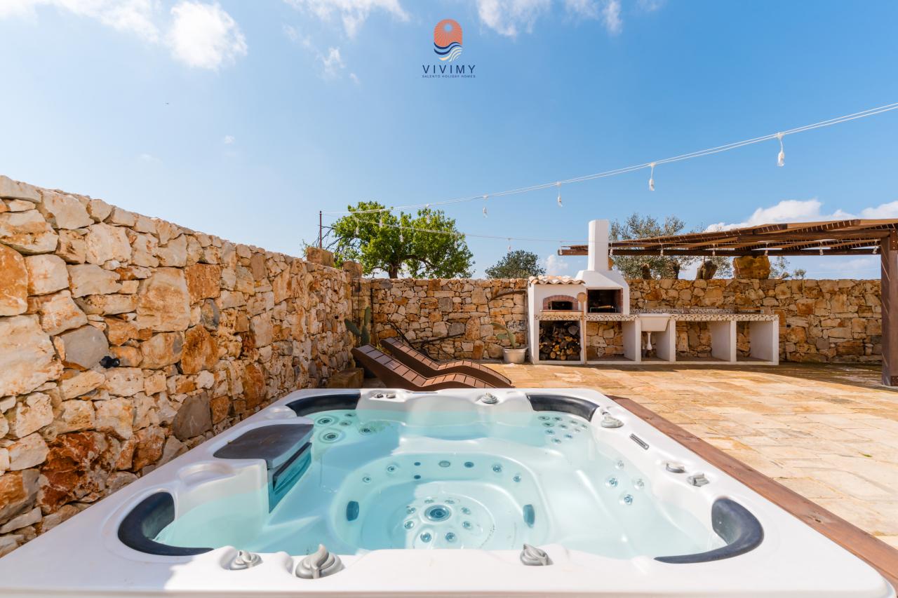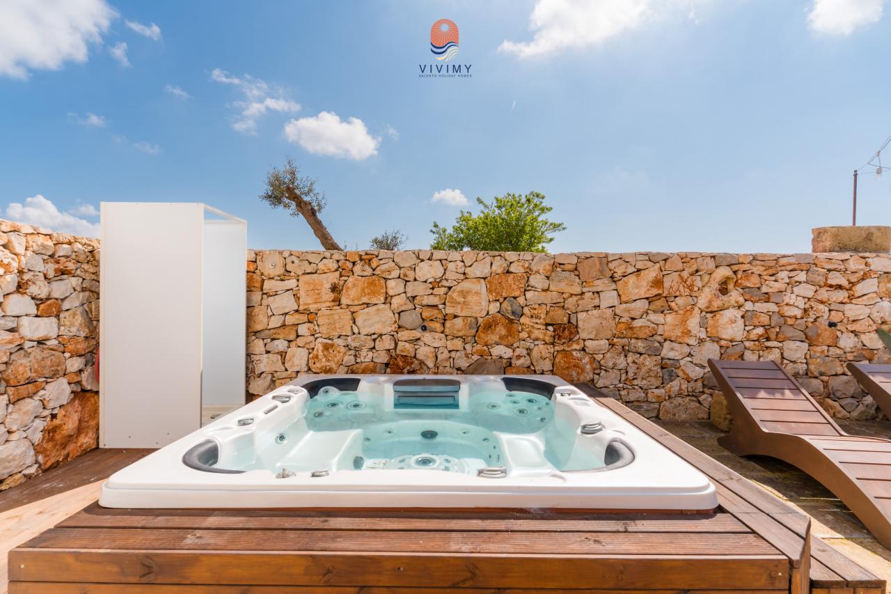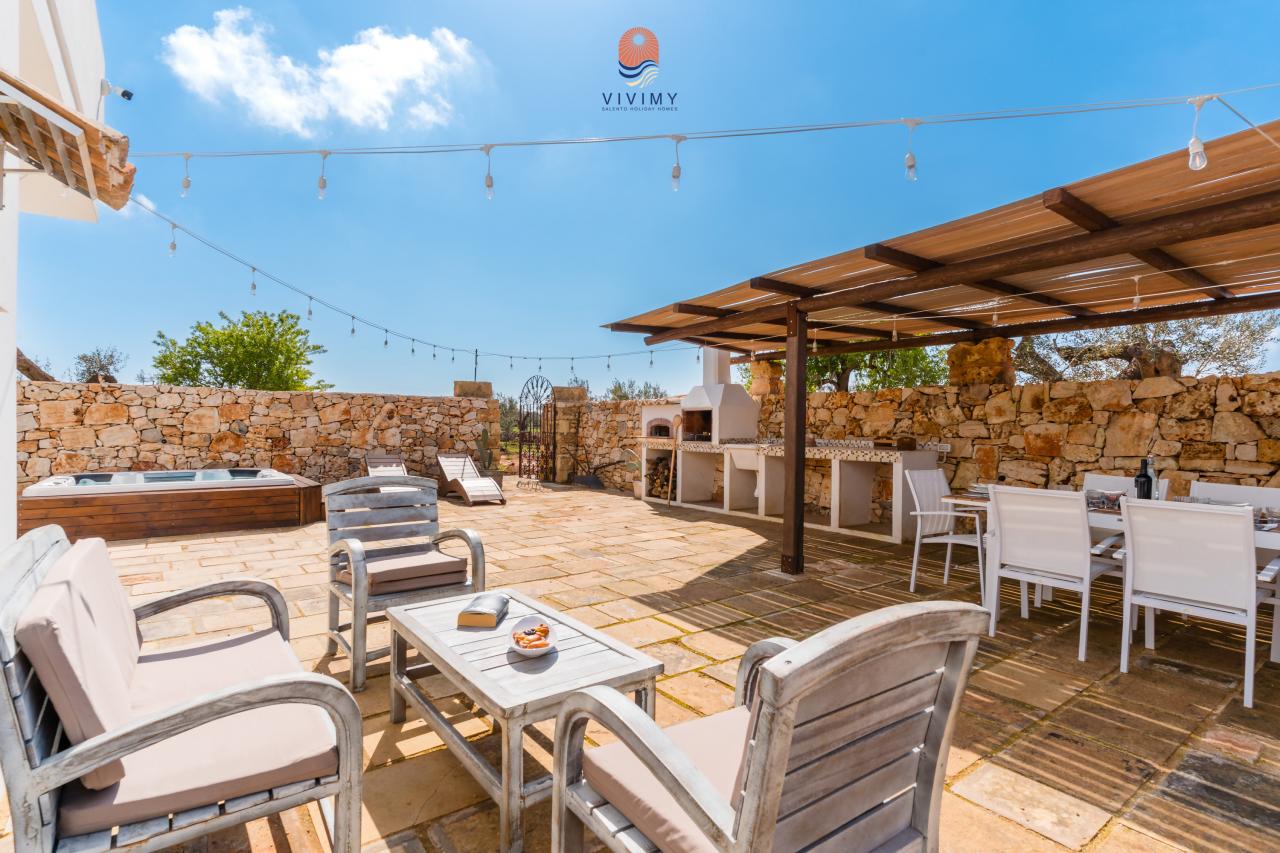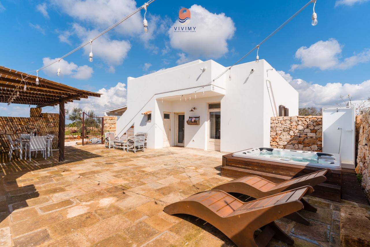 La villa dispone di 4 camere da letto accoglienti e ben arredate e di 2 bagni moderni, rifiniti con materiali di qualità e linee essenziali. Gli interni si distinguono per le volte in pietra a vista, l’uso di materiali naturali e uno stile mediterraneo contemporaneo che crea un’atmosfera calda, elegante e rilassante. La volta del soggiorno ospita un'area soppalcata con due posti letto aggiuntivi. La zona giorno è luminosa e funzionale, con cuci...